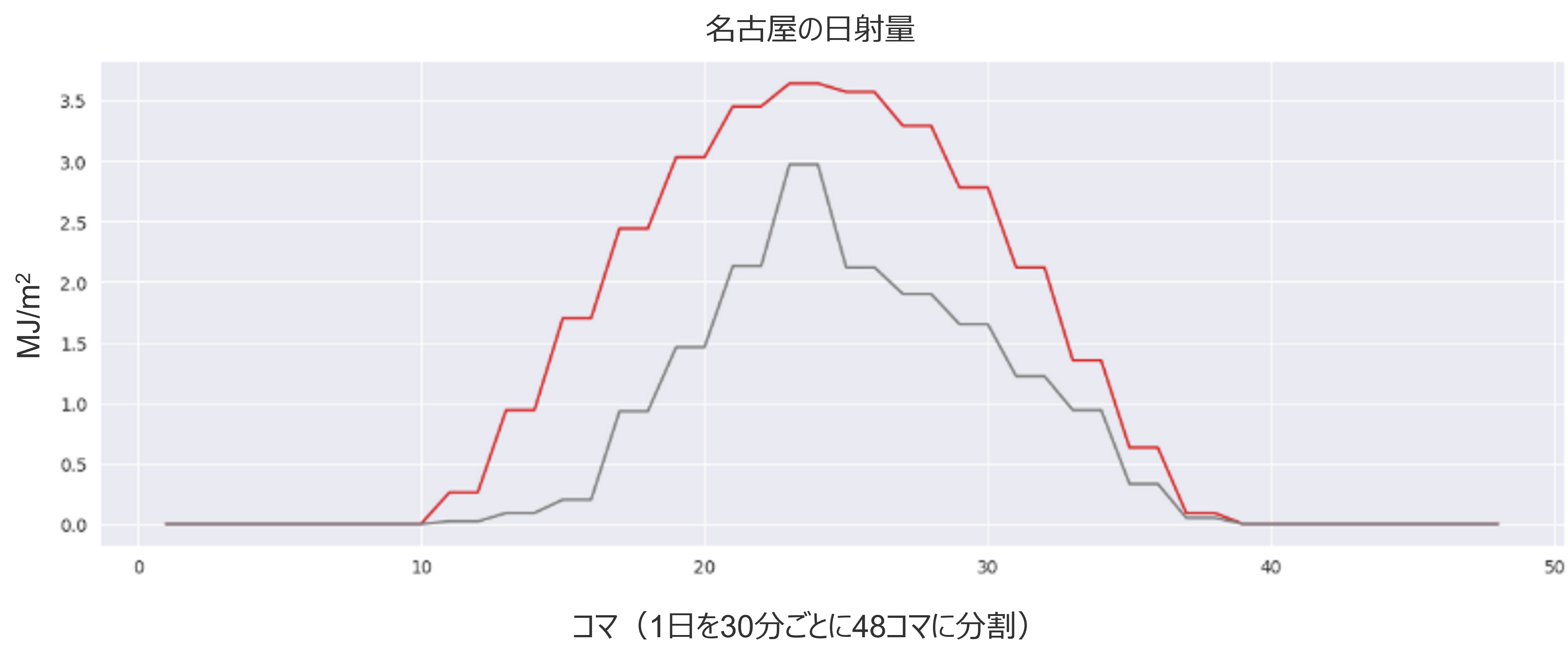まずは日射量を見てみましょう。以下に5/12と5/13の名古屋の日射量を示しますが確かに5/13は日射量が多く太陽光発電量の増加も期待できるため、価格は下落しやすかったと言えるでしょう。