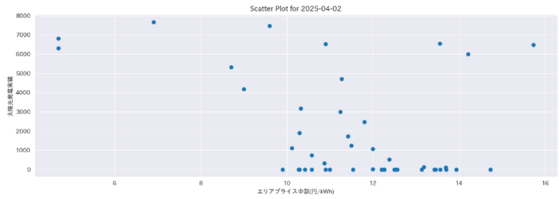それではLLMに指示を出してみましょう。今回は「2025年4月2日の中部エリアのエリアプライスと太陽光発電量の相関を可視化したい」という指示を与えます。事前に2025年のデータをすべてインプットするので、LLMとしては可視化する期間をスライスする作業も必要となります。これによって得られたのが以下の可視化です。